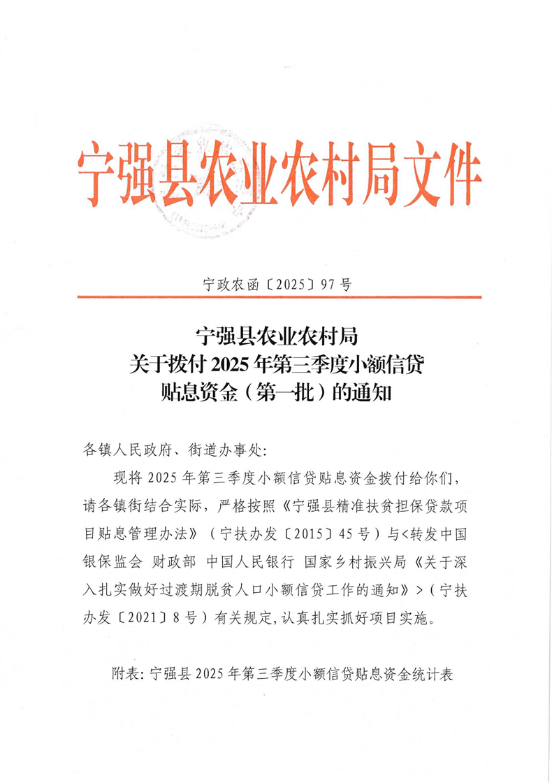 寧強(qiáng)縣農(nóng)業(yè)農(nóng)村局關(guān)于撥付2025年第三季度小額信貸貼息資金(第一批)的通知