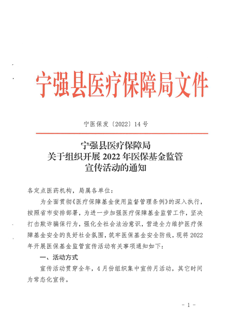 寧強縣醫療保障局關于組織開展2022年醫?;鸨O管宣傳活動的通知
